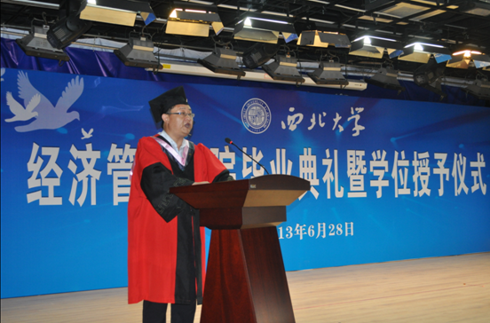 6月28日下午,我院隆重举行了2013届毕业生毕业典礼暨学位授予仪式。学院党政领导班子成员、各系系主任、教师代表、部分学生家长代表和2013届全体毕业生共500余人参加了典礼,典礼由李一凡副书记主持。在典礼上,776net必赢官网学位评定分委员会副主席、776net必赢官网副院长赵守国教授宣读了2013年毕业生人数及学位授予人数, 院长任保平教授、副院长赵守国教授分别为今年毕业的博士毕业生、硕士毕业生授予了学位,776net必赢官网学位评定分委员会委员、副院长惠宁教授、经济学系主任何爱平教授、工商管理系主任安立仁教授、会计学系主任张晓明教授、数理经济与统计学主任茹少锋教授、信息管理与信息系统系主任齐捧虎教授分别为各系本科毕业生授予了学位。