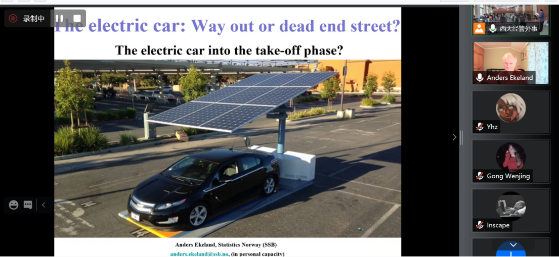Anders Ekeland教授的讲座题为“The electric car: Way out or dead end street?”。他从发明生产、注册使用、市场份额、政府补贴等方面详细介绍了电动汽车的发展历程,同时比较了世界各主要国家电动汽车的市场保有情况和支持政策。他指出,各国政府的政策支持是电动汽车行业迅猛崛起的关键,也是挪威在该领域异军突起的首要原因;而从挪威电动汽车行业发展的经验教训来看,Anders Ekeland教授认为其他国家可以从政治经济学角度加以借鉴,譬如采用税收、补贴等方法更好地实现由化石燃料车向电动汽车的过渡。如今,世界各国、各大公司纷纷投身于新能源汽车及其配套设施的发明与生产事业中,这反映出气候变化对人类社会和地球环境的影响引起了更高的关注,碳定价成为汽车制造及消费必须考虑的主要成本要素。