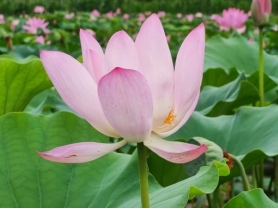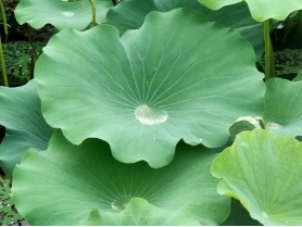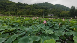 正值夏天,荷塘中荷花开得正好,恰逢刚刚下过雨,荷叶上的露水也还没有消散,显得娇艳欲滴。由于荷塘采取的是藕鱼混合养殖,所以时常也会有鱼从其中窜出。