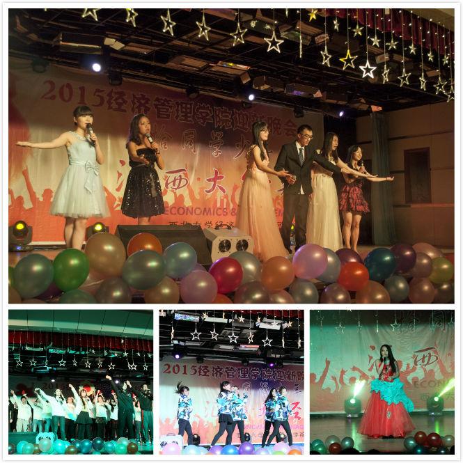 晚会在同学们精心设计的开场秀中拉开了帷幕,装扮成活泼可爱的“小黄人”从各个方向进入会场,他们一边载歌载舞,一边向现场的观众们派发礼物,着实给了全场观众一个惊喜,晚会的氛围也瞬间被引爆。在主持人闪耀登场后,节目正式开始,晚会分为了“相逢”、“青春”、“梦想”三个篇章,所有节目均由2015级学生自编自导自演,节目形式多样,工商一班、信管班、旅游管理班分别带来了歌曲串烧《致青春》、独唱《望月》、歌舞《youth boom》,为大家上演了试听盛宴;国贸班的舞台剧《在青春的日子里》带领大家回忆了从高中到大学这段青葱岁月,展现了大一新生初入大学校园的心路历程;金工班的《西大梦想秀》、工商二班的《与梦想有关的日子》,为大家展现了经管学子对于梦想的理解和追求。院学生会也准备了舞蹈、话剧、朗诵、脱口秀等形式各样的节目,晚会精彩纷呈、高潮迭起。