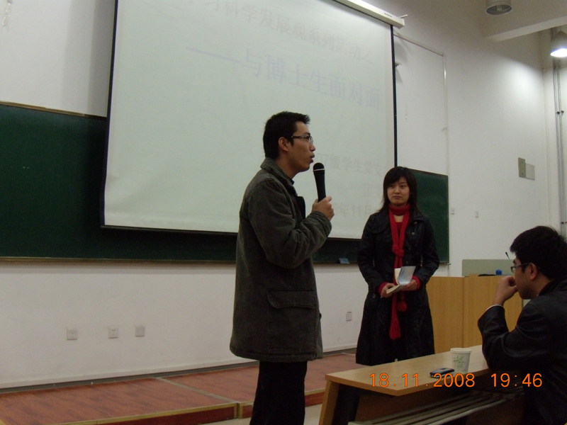 我院2008级博士生关祥勇、何磊、牛婷先后介绍了各自的学习经验和成长经历。关祥勇博士首先向同学们介绍了不同阶段学习目的的不同,他谈到在本科学习阶段要学习知识,在硕士阶段则要注重培养能力,博士阶段要注重感悟智慧。接着他又从 “只做自己喜欢的事,说话缺乏诚信,迈出第一步很难”三个方面指出了当代大学生存在的问题和缺陷,针对这些问题给同学们提出了合理确定目标的原则,即不定唾手可得的目标,不定遥不可及的目标,而且一定要以务实的精神带到学习和生活中的建议。牛婷博士根据自身的学习经历向同学们提出了四点建议:一是大学时光宝贵,大学里信息来源广泛,可接触的知识面广,一定要充分利用大学的四年时光和资源优势,抓紧时间学习。二是要会运用学到的理论知识分析思考现实问题,做到学以致用。三是学好外语。掌握一门语言对大学生成长的重要性。四是关心他人,建立良好的人际关系。何磊博士首先向同学们介绍了自己的经历,78出生的他在中专时学习的是文学专业此后在研究生时学习的是法学专业,而现在则学习政治经济学专业。每一次的发展变化都倾注了自身的耐力与毅力。他告诫同学们:“无论上天给你怎样一筐米,只要你有信心,都会作出好饭来”。