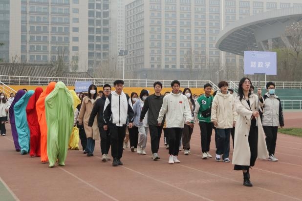 国旗、院旗、系旗迎风飘动,在方阵同学的护送下庄严而有序地经过主席台。紧随其后的各个方阵脚步坚定精神抖擞,沐浴着明媚春光,以整齐的步伐、活力四射的舞蹈、气势磅礴的朗诵展现出经管学子的别样风采。