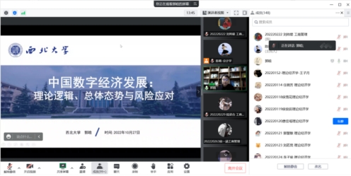 10月27日晚7点,数理经济与统计学系郭晗老师做了题为《中国数字经济发展:理论逻辑、总体态势与风险应对》的线上讲座。郭晗老师首先介绍了数字经济已成为驱动中国经济实现高质量增长的新引擎,数字经济催生出的各种新业态,将成为中国经济增长的关键点。其次,郭晗老师从四个方面讲述《中国数字经济发展:理论逻辑、总体态势与风险应对》,主要包括:(1)数字经济发展的逻辑;(2)中国数字经济发展的态势与展望;(3)中国数字经济发展面临的风险与挑战;(4)中国数字经济实现高质量发展的路径。