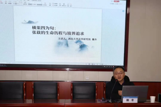 当天下午,参加共建活动的党员们来到眉县横渠镇张载祠,这是是我国北宋著名的思想家、哲学家、教育家、“关学”创始人张载的讲学之地。在巍巍终南山下,冬日的暖阳照射在古色的碧瓦青砖上,历尽岁月风霜的千年古柏仿佛在述说着关学历代先贤为民请命、为国治学的悠长故事。党员们到在讲解员的引导下,在不同的展厅了解关学文化的起源和发展,了解千年以来关学弟子们在推动中华文化发展和文明进步所做的重要贡献。魏冬教授进行现场教学,以《横渠四为句:张横渠的生命历程与境界追求》为题做了讲座。他指出,关学作为中国传统文化的重要组成部分,有着非常重要的历史影响和现实意义。中国共产党人是中华五千年优秀传统文化的继承者、宣传者和发扬者。张载倡导的“为天地立心,为生民立命,为往圣继绝学,为万世开太平”这四句话与党的历史使命、根本宗旨、奋斗目标有内在一致性,关学精神的“勇”,更是中国共产党人有为担当的生动体现。
