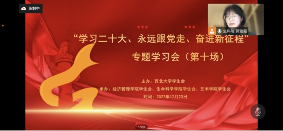 《中共中央关于认真学习宣传贯彻党的二十大精神的决定》指出,学习宣传贯彻党的二十大精神是当前和今后一个时期全党全国的首要政治任务,事关党和国家事业继往开来,事关中国特色社会主义前途命运,事关中华民族伟大复兴。为深入学习宣传贯彻党的二十大精神,提高广大同学的政治觉悟,夯续红色根基,12月23日晚,由西北大学学生会主办,776net必赢官网学生会、艺术学院学生会、生命科学学院学生会承办的“学习二十大、永远跟党走、奋进新征程”专题学习会(第十场)正式举办,会议由生命科学学院学生会主席团成员郭雅霜同学主持,校学生会代表、生命科学学院、艺术学院和776net必赢官网学生会工作人员、学生代表参加会议。